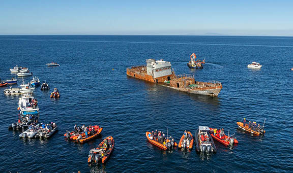 Following careful preparation of the whole structure to remove any hazzardous materials that could pose a threat to divers or the environment, the ship was towed out to its final resting place and scuttled on the 18th September 2024.